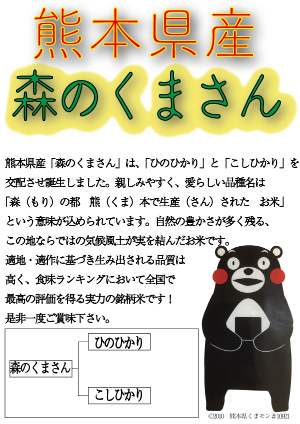 森のくまさんは、『森の都熊本で生産された米』という意味が込められているお米で、ヒノヒカリに次ぐ主要銘柄の1つであります。食感は粘りが強く美味しくいただけます。