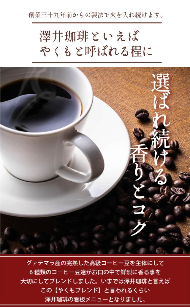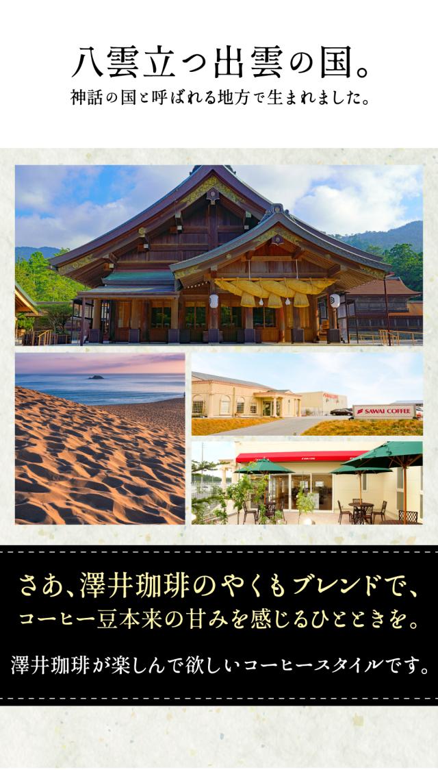 やくもブレンドフルーティーな香りが、鼻腔を刺激する逸品です島根県は古くから出雲神話や小泉八雲が有名な地域です。澤井珈琲がこの島根県から全国へ美味しいコーヒーを提供したいと考えたのが、こちらの「やくもブレンド」。花のような香りと気品のあるきれいな味わいが特徴のグアテマラSHBをベースにした豊かな旨みの香るブレンドコーヒーです。 やくもブレンド濃い味じっくり煎り上げたコク深い、濃厚なブレンドコーヒー優しく上品な口当たりと爽やかな芳香が美味しいやくもブレンドを、もっともっと美味しく出来ないか?と、当店の焙煎技師達が研究に研究を重ねて、創り上げたのがこちらの「濃い味」タイプ。通常の2倍の時間を使って、じっくりじっくりと丁寧に煎り上げた本場ヨーロッパスタイルの深煎りタイプに仕上がっております。 | |