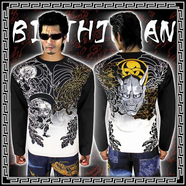 和柄絡繰魂風神雷神と般若刺繍長袖シャツ(ロンT) 231373黒 カラクリ服チョイワルちょい悪ヤクザヤンキーチンピラオラオラ系悪羅悪羅系 悪党の店 バースジャパン BIRTHJAPAN