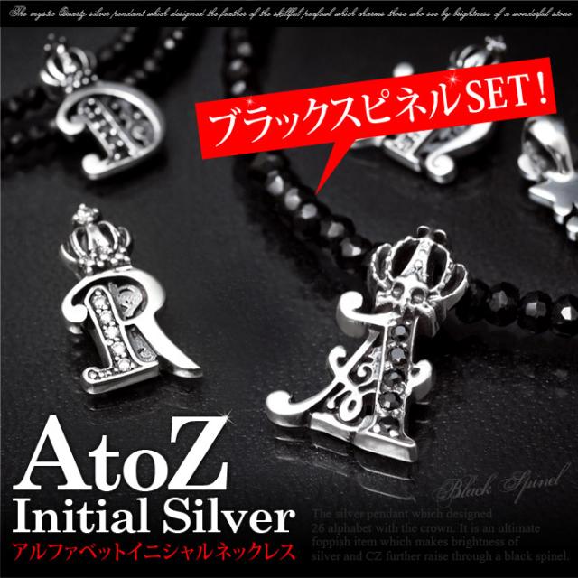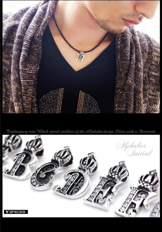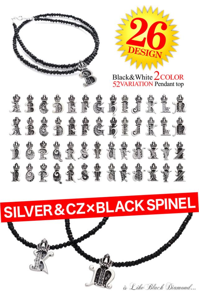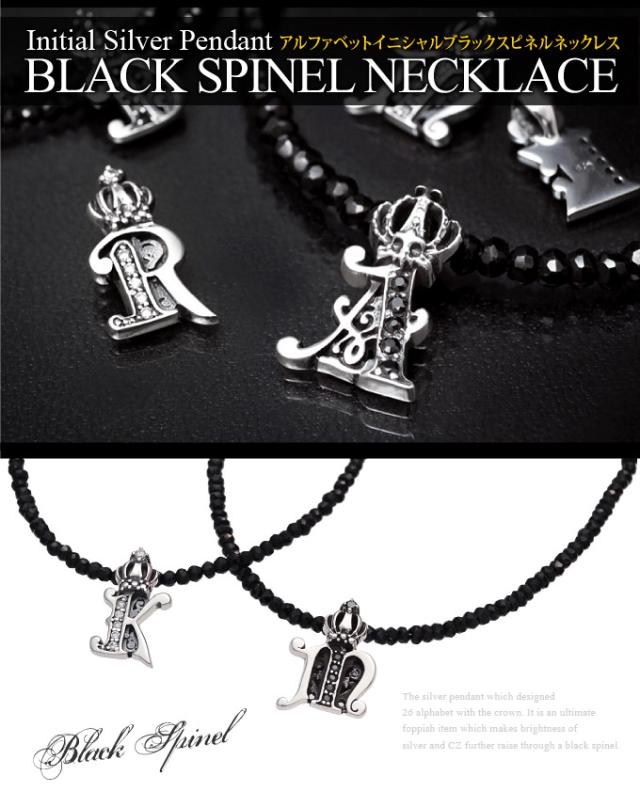 天然石ネックレス ブラックスピネル メンズ シルバー925 イニシャル アルファベット 王冠・クラウン pe1922