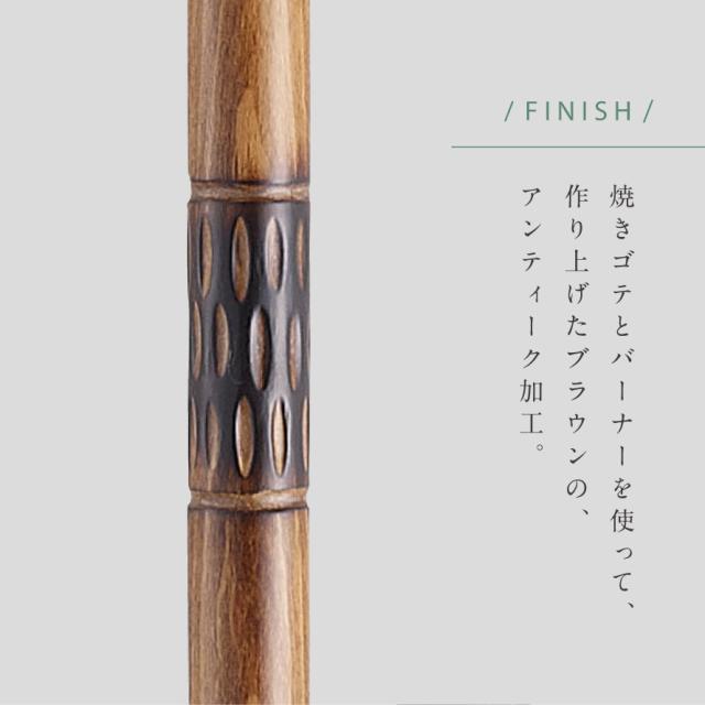 また淡いブラウンと濃いブラウンの入れ混ざった美しい演出も匠の技の一つです。アンティーク加工と呼ばれるこの装飾は焼きゴテとバーナーを使って仕上げられます。木目や表情を見極めながら仕上げていく工程はまるで絵画を仕上げる芸術家の様。1本1本仕上がりの異なる拘りの逸品です。