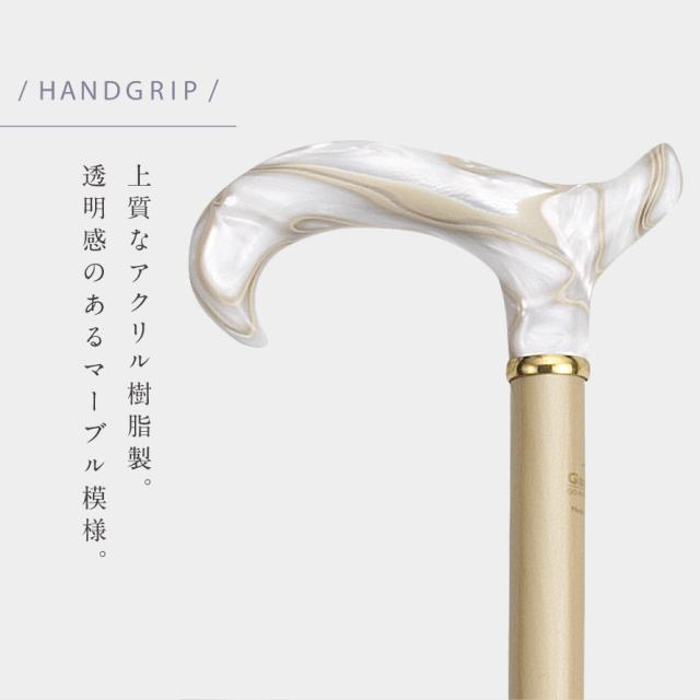 美しいマーブル模様を描く本品のグリップはアクリル樹脂製。アクリル樹脂は『プラスチックの女王』の異名を持ち大変美しく優秀な素材です。光線透過率ではガラス92%に対しアクリル樹脂は93%に達し、耐衝撃強度はガラスの10倍〜16倍に達します。透明度の高さと丈夫な特徴を生かし飛行機の窓や水族館の巨大水槽に使わる他、加工もしやすく様々な装飾品にも使われます。本品では大理石の様なマーブル模様に仕立てました。金色のリング、パールカラーのシャフトとも相まって重厚且つエレガントな印象を与えてくれます。キズも付きにくいので美しさも長持ち。長くご愛用して頂けるステッキです。
