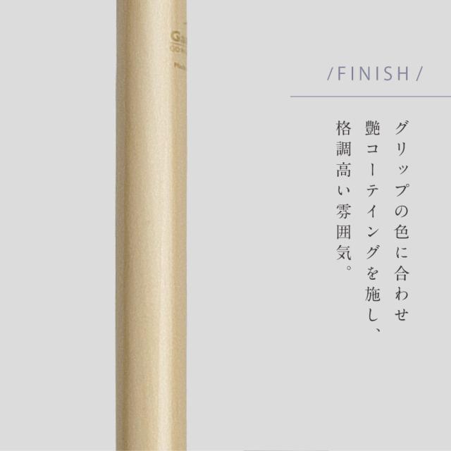 シャフトのブナの木は曲が強く真っすぐに加工するのに高い技術を要します。しかし一度仕上がれば柔軟性があるのに折れにくい特性があり、古くはスキーの板にも使われるほど丈夫な素材。本品はブナの表面にグリップの色に合わせた艶コーテイングを施しました。大理石を思わせる重厚なグリップと相まって格調高い雰囲気を醸し出します。