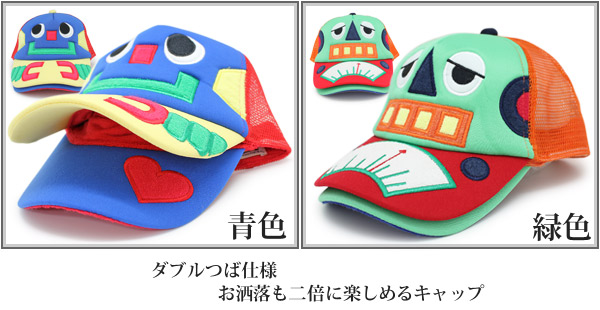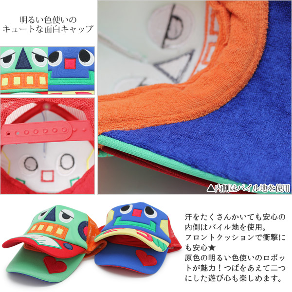 おどけたロボットの目に思わず釘付けになってしまいそうな、お茶目なキャップ。原色の明るい配色で、子供の元気さをより感じられるデザインです。なんとつばが二重になっているという、作り手の遊び心を取り入れたちょっと不思議な構造もご愛嬌★奥にはこっそりハートマーク★周りの視線も独り占め!!