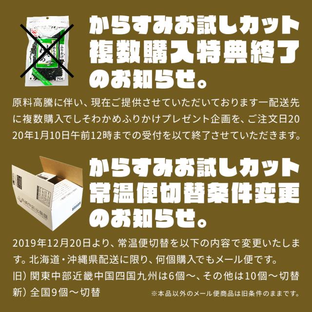 | 特筆事項 | 1配送先に2セット以上注文で魚の屋しそわかめふりかけプレゼント企画は、2020年1月10日午前12時を以て終了いたします。無添加・無着色・天然物につき、色みに個体差があります。3〜4日程度であれば、鉄や鉛製のポストに置いておいても品質に問題ございません。但し長期間そのまま放置すると、変色やカビの原因となりますため、速やかに回収後、高温多湿を避けて常温または冷蔵保管してください。メーカーによりパッケージデザイン(商品の外観)や原材料の一部等は予告なく変更される場合があり、商品ページは旧情報で表示されている可能性がございます。予めご了承ください。 |