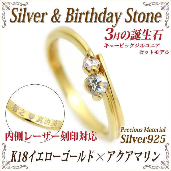 アクアマリン リング 送料無料 刻印無料 シルバー925 誕生石 脇石キュービックジルコニア ツインストーン 指輪 ゴールドモデル