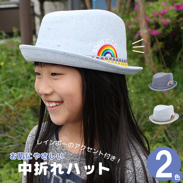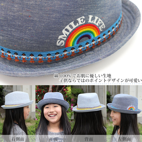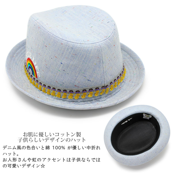 ちょっぴりカッコいいお洒落が楽しめる中折れハットです。見た目の形はどこからみてもパパママにも人気の大人と同じ中折れハット☆でもやっぱり子供らしくなきゃね♪ということで、巻き部分にはお人形さんが一周ぐるっとおててをつないでくれてたり、カラフルなレインボーのアクセントまで装着!コットン100%とお肌に優しく、デニム風の色合いも可愛らしいですね♪