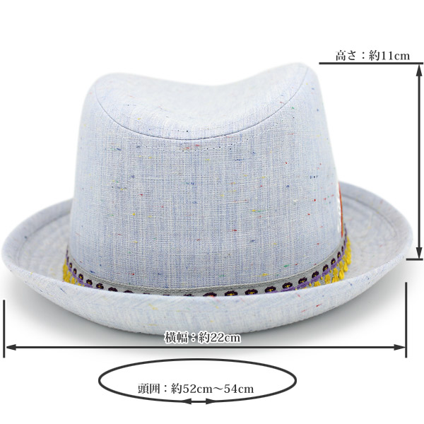 | サイズ | サイズ表記52〜54cm(頭囲:約52〜54cm、高さ:約11cm、横幅:約22cm[つばも含む]、つばの長さ:約4.5cm) |