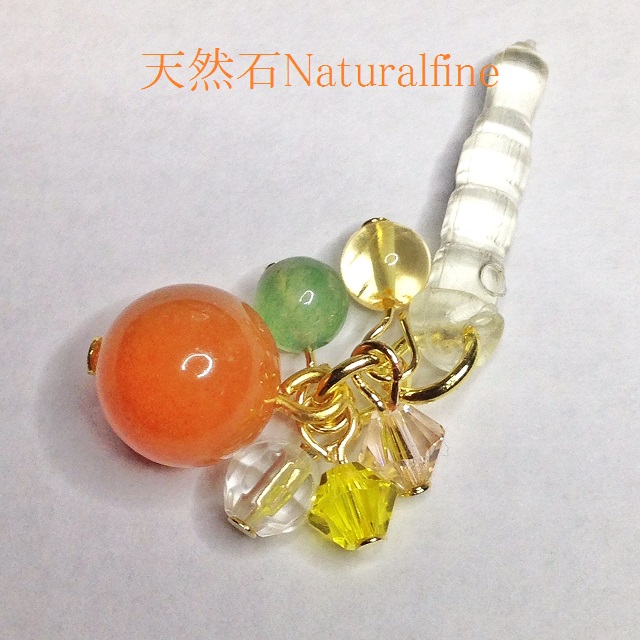 こちらは、パワーストーンのアベンチュリンとシトリンのイヤホンジャック(ストラップ)です。スワロフスキーがアクセントになっていると思います。