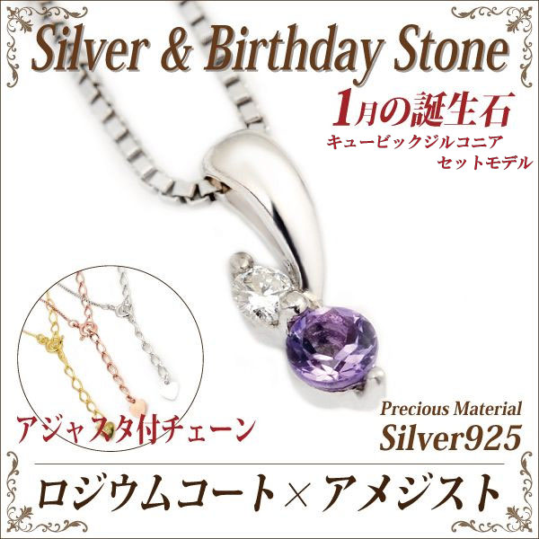 アメジスト ネックレス 送料無料 シルバー925 誕生石 ペンダント 脇石キュービックジルコニア ツインストーン チェーン 付 ロジウムモデル