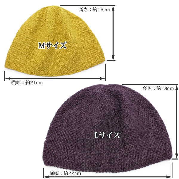 Mサイズ(頭囲:約56〜58cm、平置きで 幅:約21cm、高さ:約16cm)、Lサイズ(頭囲:約59〜61cm、平置きで 幅:約22cm、高さ:約18cm)