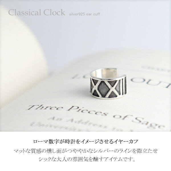 クロック ローマ数字 ブラック イヤーカフ 1P 片耳用 シルバー925 シンプル スタンダード ノンホールピアス イヤークリップ フェイク