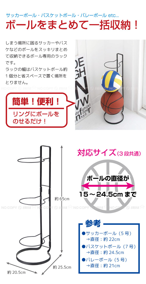 ラックの幅はバスケットボール約1個分と省スペースで置く場所をとりません。