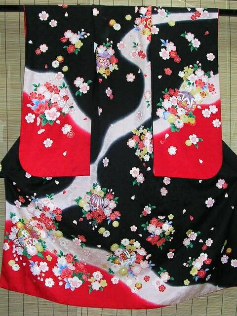 七五三レンタル★七歳女の子着物セット★黒地につづみと桜柄noE