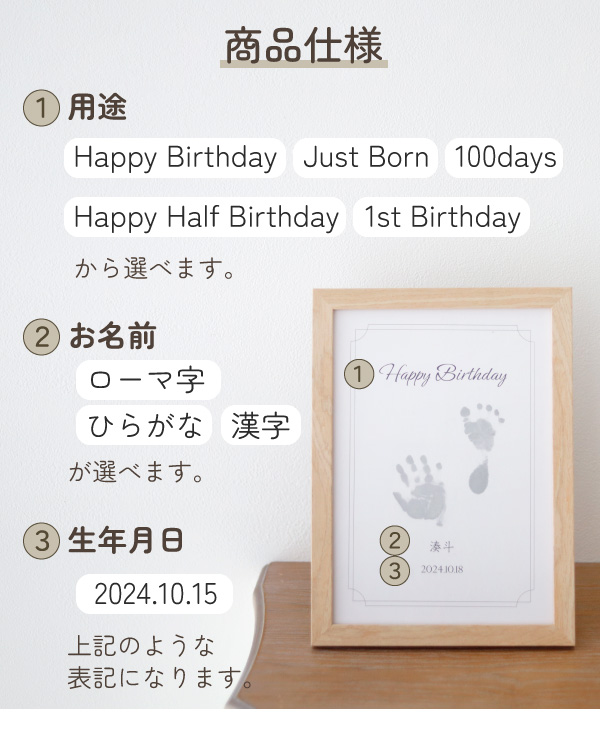 | 用途 | ・手形 足形 フレーム フォトフレーム 命名書 ・入園 卒園 入学 卒業 ペット ペット足形 ・出産祝い ベビーシャワー(baby shower) ・お誕生日プレゼント ハーフバースディ 1歳 1.5歳 2歳 ファーストバースデー ファーストトイ ・初節句 端午の節句 ひなまつり 桃の節句 ・授かり婚 結婚祝い クリスマスプレゼント 友人 友達 上司 部下 先輩 後輩 同僚 先生 孫 兄弟 姉妹 娘 息子 甥 姪 ハーフバースデー ニューボーン 新生児 双子 保育園 幼稚園 |