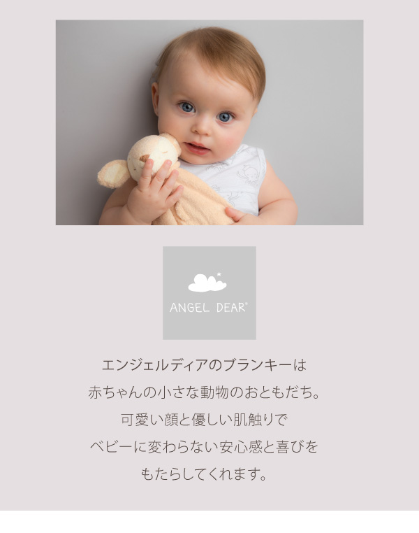 エンジェルディアのブランキーは動物たちの可愛い表情と柔らかい肌触りで赤ちゃんを虜にし、安心感をもたらせます。小さな手で握りしめたり、抱き寄せたり、どこへでも連れて行きたくなる存在に。