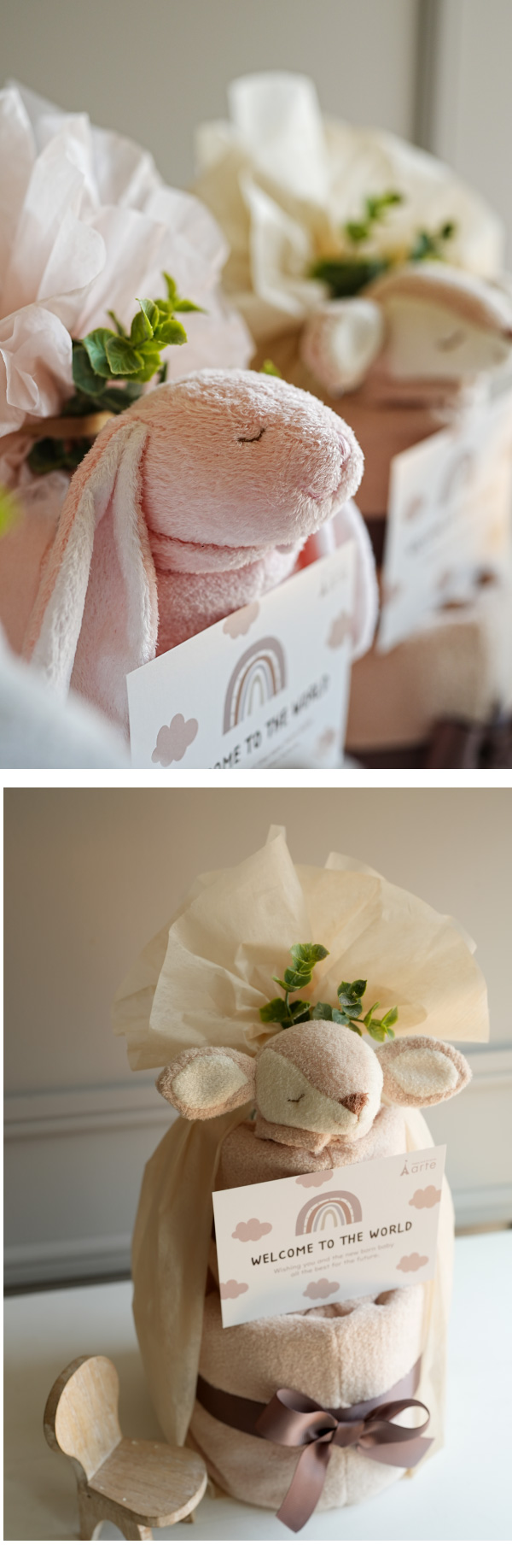 赤ちゃんの初めてのお友達♪アニマルブランキーが付いたおむつケーキです。