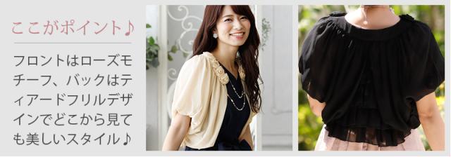 衿元の花モチーフやパフスリーブ、バックのティアードなど女性なら誰もが憧れるディティールが施されています。