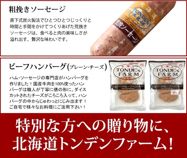 骨付きソーセージ(5本) 400g、石狩川ベーコン(スライス) 200g、荒挽ウィンナー(5本) 100g、ピルカウィンナー(4本) 120g、荒挽ソーセージ 250g、ビーフハンバーグ300g(100g×3個入り)、チーズ入りビーフハンバーグ300g(100g×3個入り)、トンデンファームオリジナル化粧箱入り
