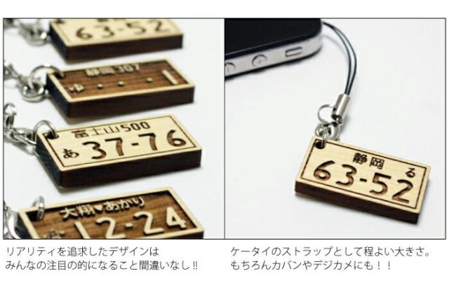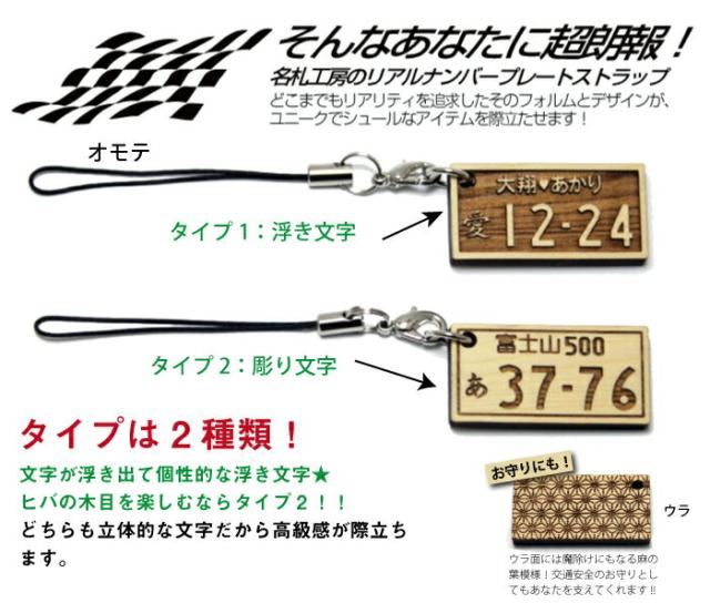 | 木の素材そのものを生かしたデザインだから、 経年で色が変化するのも楽しみのひとつ。 自慢の技術が際立つ、味わい深い浮き文字タイプ リアリティ感じる堀り文字タイプ 2つの種類からお選びいただけます。 車用、バイク用があるから愛車家だけでなく バイクオーナーへのプレゼントにもおすすめ。 裏面には邪気を払うなど魔除けの意味もあるといわれる縁起柄の麻の葉模様を施しました。 交通安全祈願としてお守りにもぴったりです。 ケータイ・スマホだけでなく鞄、ポーチなど付ける場所を選ばずお使いいただけます。 誕生日、記念日、縁起のいい数字・・・ 愛車のナンバーに思い入れのある数字を選んでいる方は少なくありません。 好きな数字を選んだ特別なナンバープレートだから、 実際のナンバーを忠実に再現したこちらのストラップなら喜ばれること請け合い! 意外と忘れがちな車のナンバー。 ストラップに刻印して持ち歩けばいつでも安心。 家族で複数の車を所有している方にも重宝します。 また、贈る相手のナンバーを知らない場合でも 誕生日とお名前を刻印すれば、ずーっと使える 世界にただ一つ、オリジナルストラップの特別な贈り物。 ミニチュアにしたような可愛さだから女性にも男性にも、車好きなら絶対喜ぶおすすめギフトです。 |