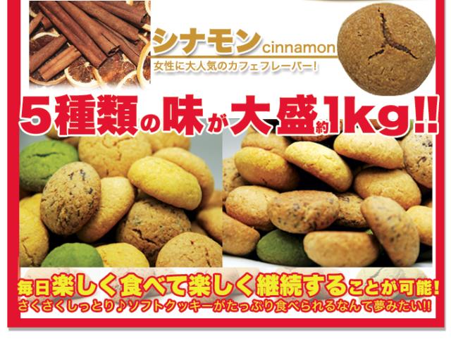 人気のヘルシーおやつ!おから豆乳クッキーがチョコ、オレンジ、チーズ、シナモン、抹茶の合計5種類の味で、納得のボリュームどっさり1kg!■品名:おからクッキー(オレンジ・シナモン・チーズ・チョコ・抹茶)■名称:焼菓子■原材料名:小麦粉(国内製造)、砂糖、おから、液鶏卵、マーガリン(乳成分・大豆を含む)、チョコレート、豆乳、オレンジピール砂糖漬け、粉末油脂(植物油脂、コーンシロップ)、ココアパウダー、シナモン、砂糖混合異性化液糖、抹茶、クロレラ末/乳化剤、膨張剤、香料、カゼインNa、カロテン色素■内容量:250g×4袋■賞味期限:製造より常温90日(約30日〜90日弱賞味期限が残ったものでのお届けとなります)■保存方法:直射日光、高温多湿を避け冷暗所で保存してください。■販売者:株式会社天然生活※開封後は冷蔵庫保存の上、賞味期限に関わらず3日を目安にお召し上がりください。※本商品は「おから」を使用したソフトクッキーです。