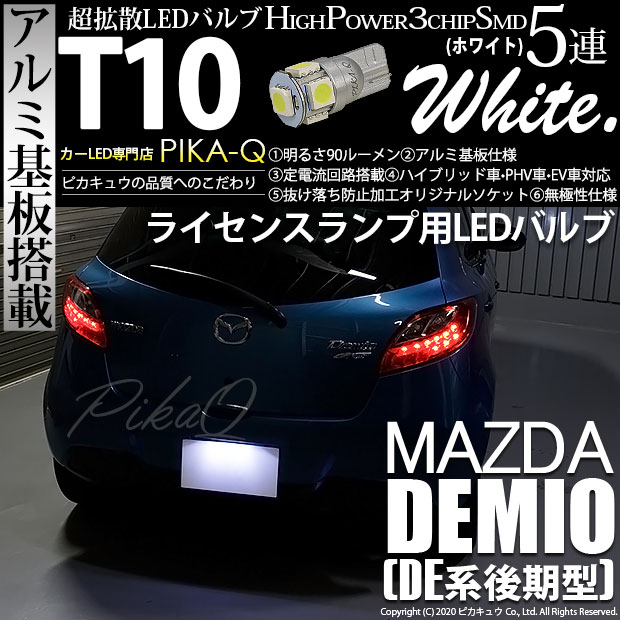 | ピカキュウ,LED専門店,LEDバルブ,LED,SMD,T10,W5W,T10 HIGH POWER 3CHIP SMD 5連ウェッジシングル球,アルミ基板,90lm,長持ち,ホワイト,ライセンスランプ,番号灯,マツダ,MAZDA,デミオ,DEMIO,DE系,後期,de5fs |