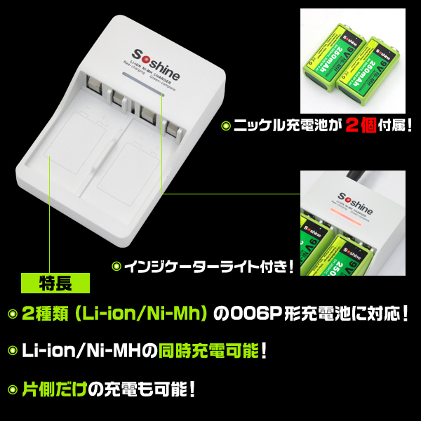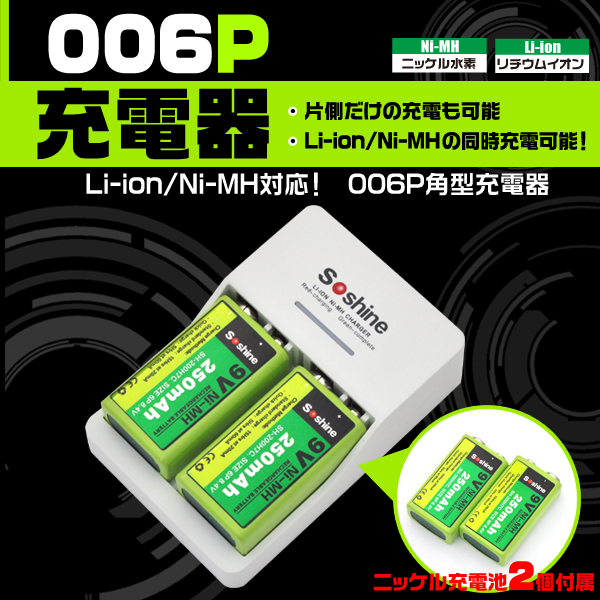 006P角型充電器 9V 250mA ニッケル充電池2個付属 Li-ion Ni-MH両方対応 充電器 片側だけでも充電可 006P型 角型電池 充電機器 楽器 機材 リチウムイオン充電池 ニッケル水素充電池両方対応 積層電池 6P型 9V角型 9V電池 おもちゃ トランシーバー ラジコン