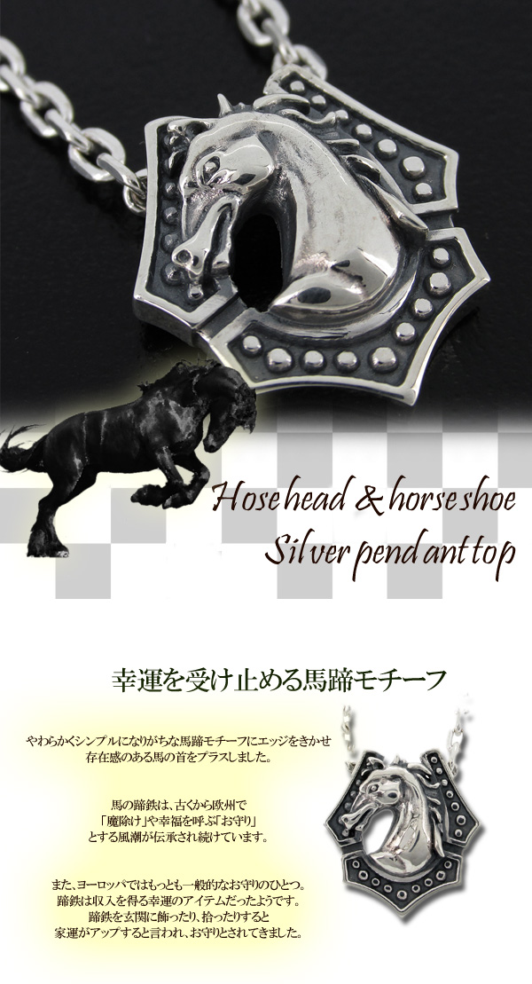 ★送料無料★ホースヘッド&ホースシュー シルバーネックレス(チェーン付きペンダントトップ ペンダントヘッド)/馬蹄/ネックレス/メンズ/SILVER925/首飾り