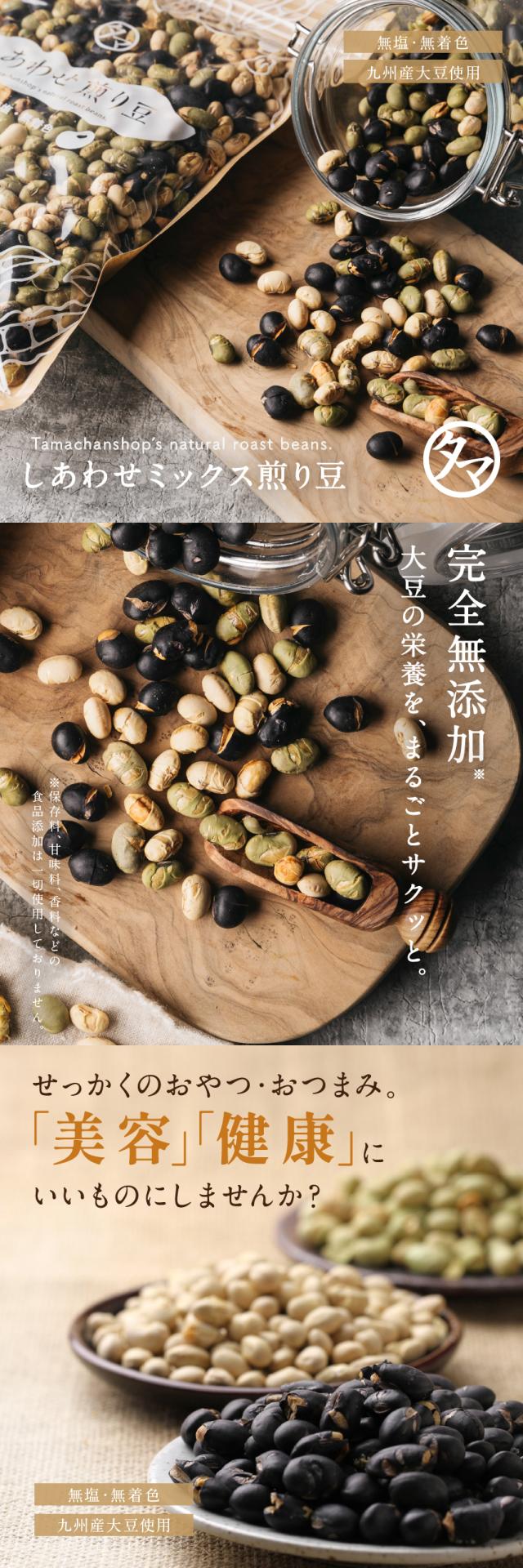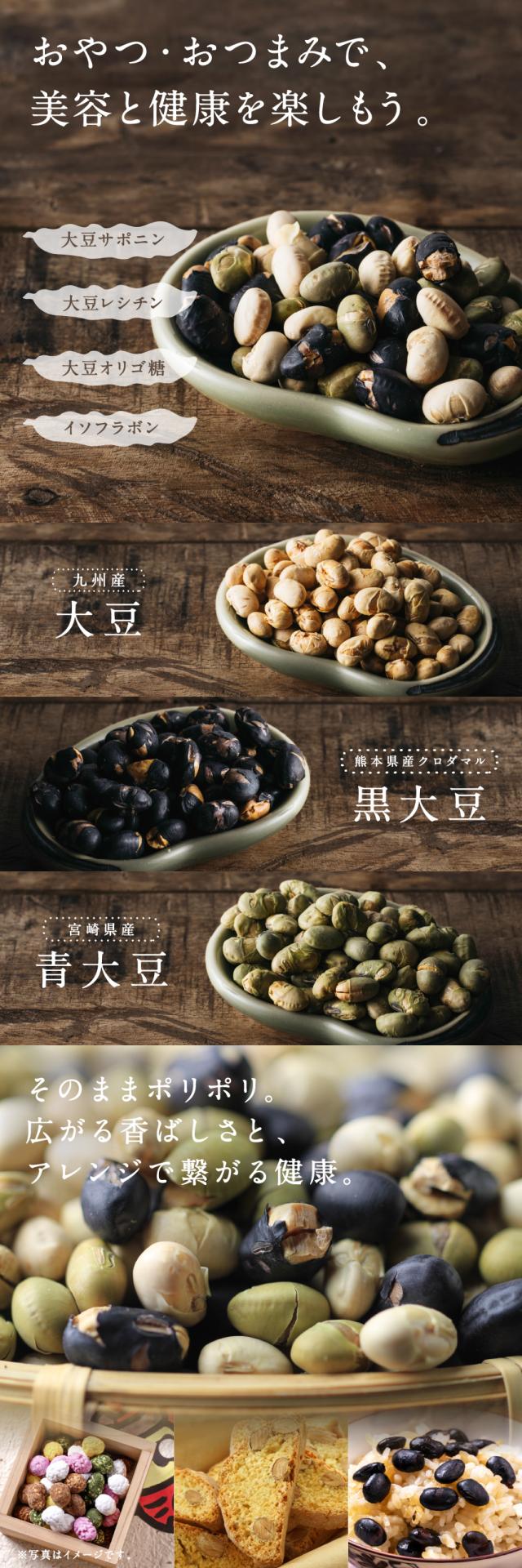 栄養満点“大豆”をサクッとまるごと!全て国産原料の無添加煎り大豆シリーズ。九州産 大豆、 熊本県産 黒大豆、宮崎県産 青大豆をそのまま無添加焙煎したサクッと美味しい煎り豆おやつです。