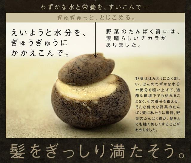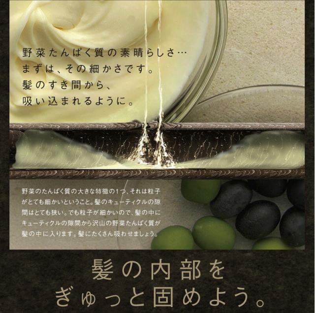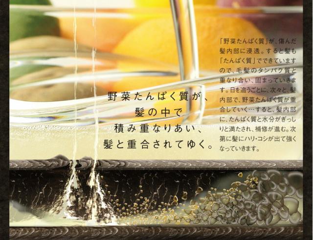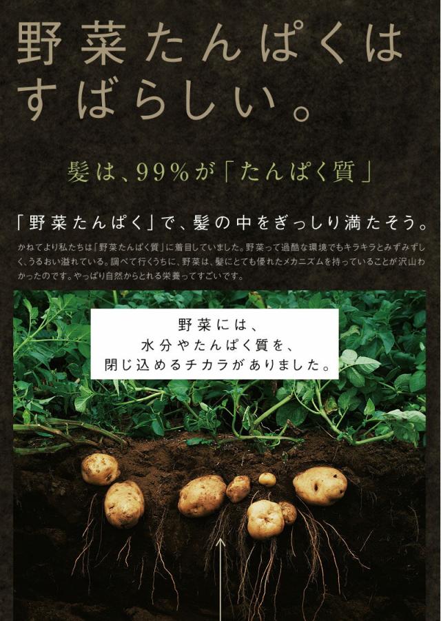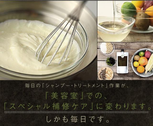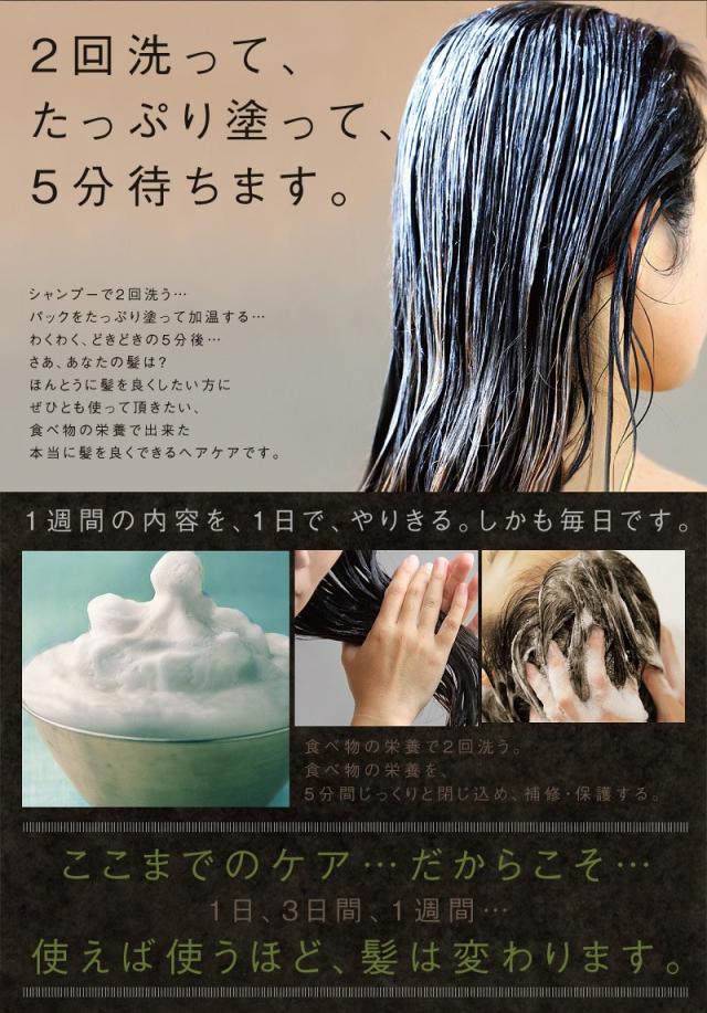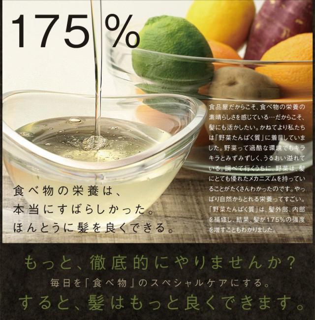 食の力と美容界の新技術・新素材を駆使した美容エステレベルの濃厚成分配合。ダメージヘアが気になる方にもオススメ。おうちで5分の濃厚ヘアエステ体験はいかがですか。ココヤシからとれる最高級の洗浄成分を贅沢配合したシャンプーは細かくもっちり、まるで雲の泡。野菜たんぱく質などの保湿&補修成分をふんだんに配合したヘアパックで濃厚ヘアケア。使うたびにツヤ、手触りがぷるぷる、もちもちに。通常ヘアケアの約5倍の極上CMC成分。そのレベルはまさに美容施術レベル。