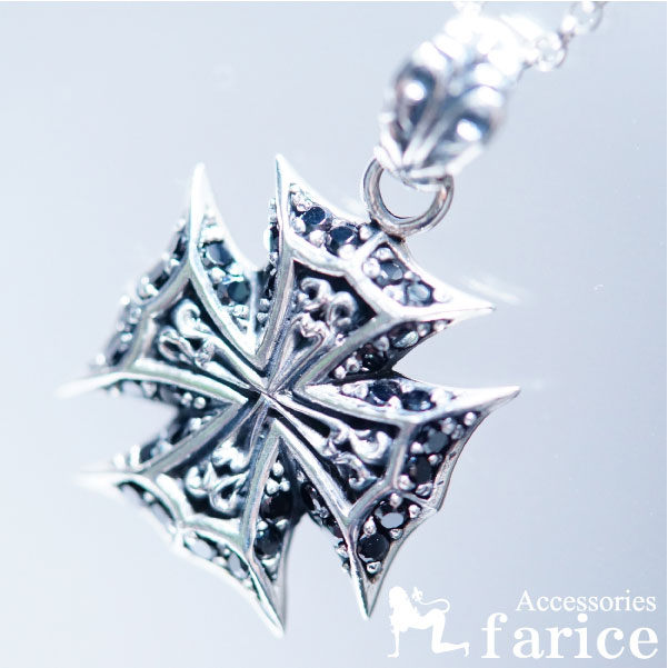クロス 十字架 ブラックジルコニア アラベスク ツタ模様 シルバー925 ペンダント ネックレス