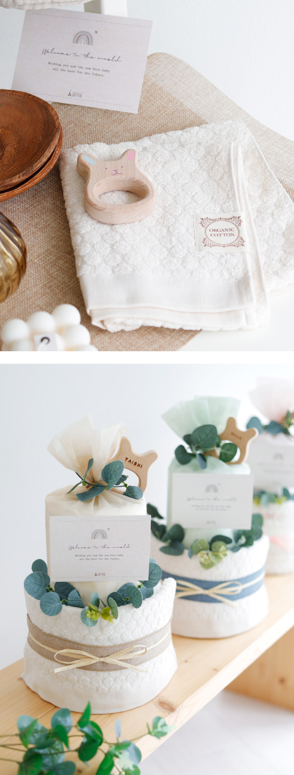 オーガニックにこだわっておむつもオーガニック素材を使用した赤ちゃんに安心安全なおむつケーキ木のぬくもりを感じられるうさぎのビーズラトルと日本製のオーガニックフェイスタオルでやさしい気持ちになれるおむつケーキです。