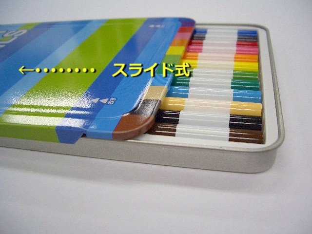 スライド式の缶ケースに入った色鉛筆…お子様でも開け閉めが簡単です。