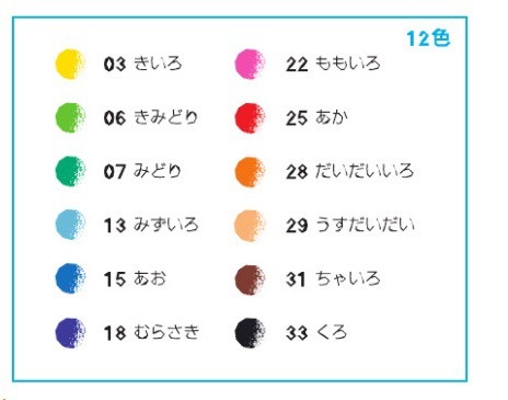 12色(黄色・黄緑・緑・水色・青・紫・桃色・赤・橙・うすだいだい・茶・黒)