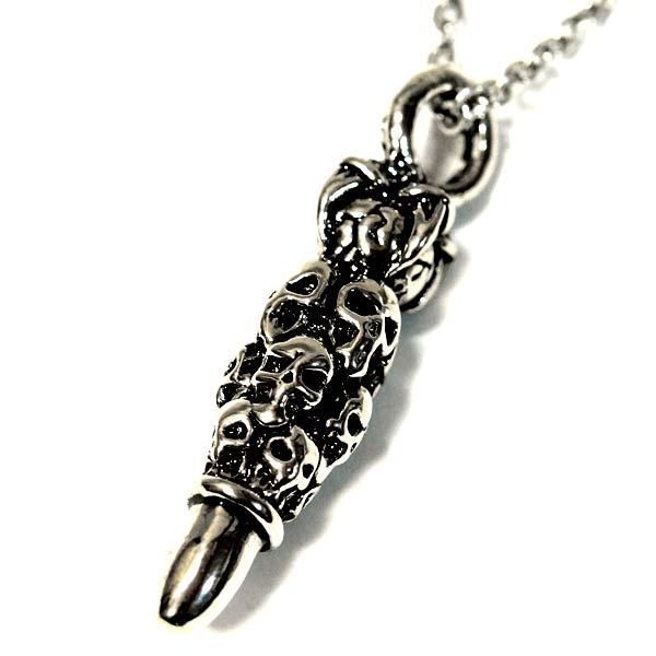 バレット(弾丸)をモチーフとしスカルと4本の爪に加え脳みそもデザインされたちょっと不気味なペンダントトップです。妖気を漂わせる暗黒色のボディからは無数のスカルが浮かび上がり迫力を感じさせるデザインですね。ペンダント上部には脳みそを掴んだ4本の爪が装飾されておりややオカルトティックな印象です。爪部分に細かく彫られた鱗の紋様が魔界の使者を表現したディテールで死を連想させるスカルとよく合っていますね。バチカン(チェーンを通す輪っか)含めて縦約4.5cmの大型サイズは胸元に強烈なインパクトを与えペンダントの湧き出る禍々しいオーラを放ってくれることでしょう。