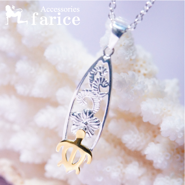 プルメリア&スクロール&ホヌ装飾 サーフボード イエローゴールドペアカラー ハワイアンジュエリー シルバー925 ネックレス