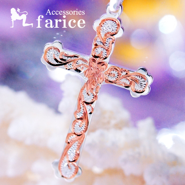 クロス 十字架 プルメリア 花 スクロール 波 ピンクゴールド ハワイアンジュエリー シルバー925 ペンダント ネックレス