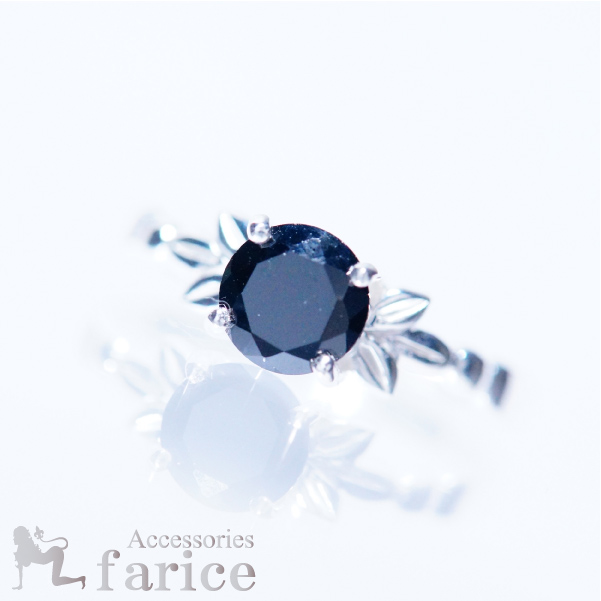ノーブルブラックキュービックジルコニアストーンの可愛い葉っぱ付き花柄リング