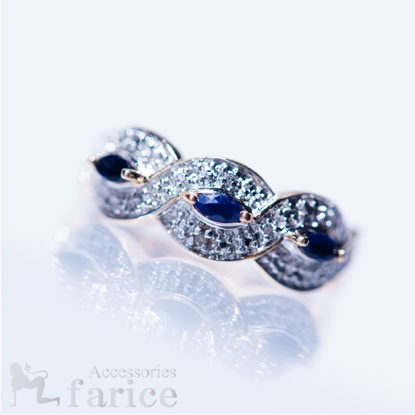 ダークブルー天然石&ウェーブ銀玉ストーン エレガントイエローゴールドジュエリーリング【17号】