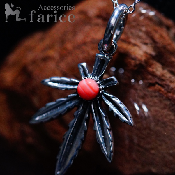 ★商品のコメント★ 特徴的なフォルムとガンジャの愛称で知られる人気のマリファナモチーフシルバーペンダントです。マリファナモチーフには燻し加工が施されており、黒褐色のくすんだ風合いに渋さが光りますね。ペンダントヘッドの中心には色鮮やかなピンクコーラルが装飾され、深みのある燻し銀の中でとても綺麗に映えています。