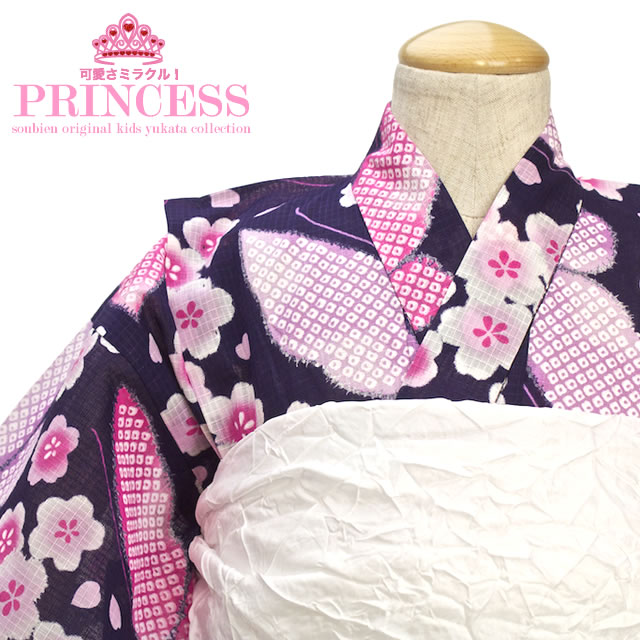 浴衣 キッズ 子供 花火大会 夏祭り bonheur saisons(ボヌールセゾン) classic mini 藍色 蝶 桜 女の子 【100cm】【110cm】【120cm】【130cm】