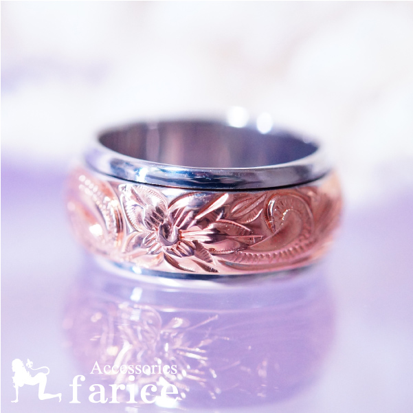 プルメリア(花)とスクロール(波)彫りのピンクゴールドバイカラーハワイアンジュエリーリング