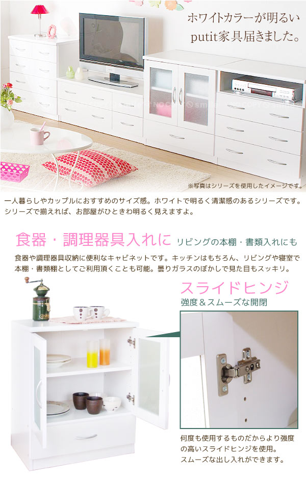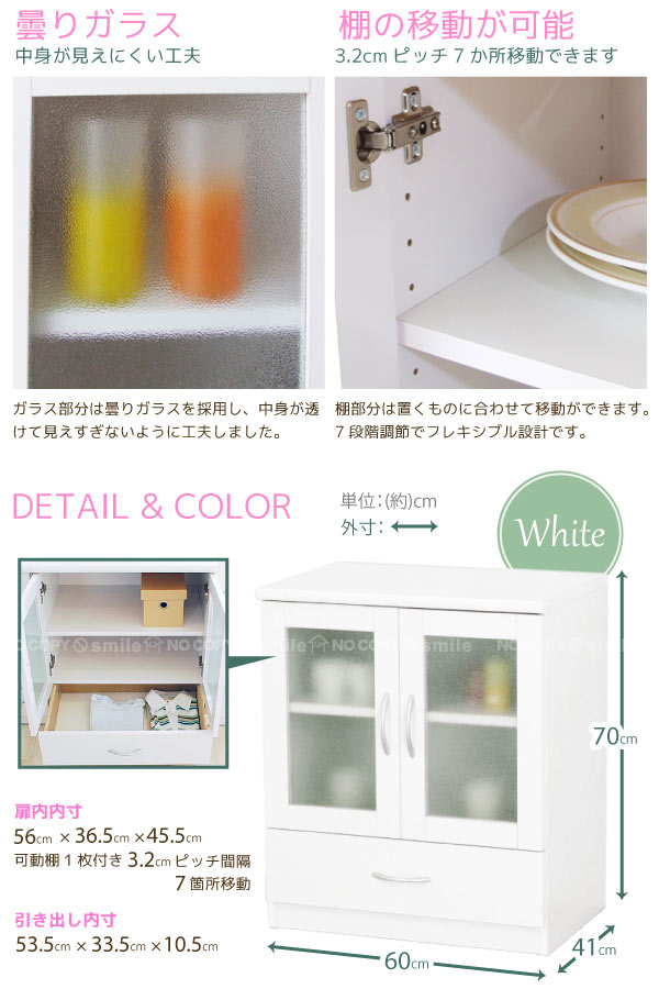 引き出しストッパー付き。強度のあるスライドヒンジなので長く使えますよ。曇りガラスで見た目もスッキリ&プライバシーも万全!!内部の棚は3.2cmピッチ・7段階に移動できる可動棚になっています。