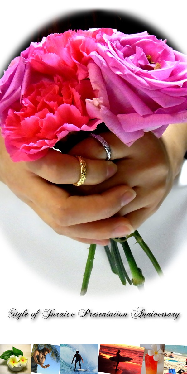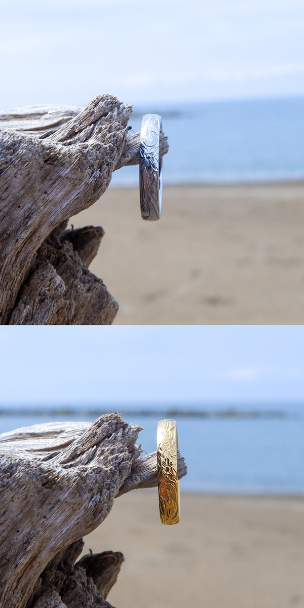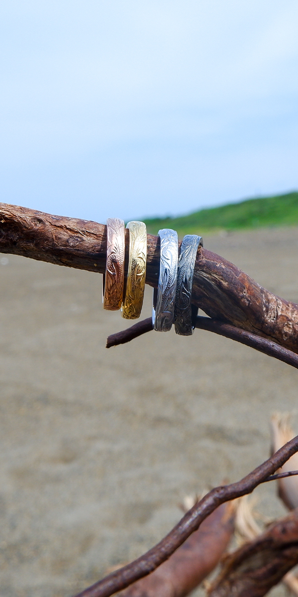 プルメリア(花) 「気品」「魅力を引き出してくれる」「大切な人の幸せを願う」 大切な人を想うという意味からプレゼントにとても人気のモチーフです。 女性の魅力を引き出して幸せに導くとされ、ハワイの人々に愛されている花です。 スクロール(波) 「幸せを運んできてくれる」「目標に挑戦して乗り越える」「永遠の愛」 波は幸せを運んできてくれる力があると信じられていました。 波に繰り返しチャレンジして乗り越え、成功をつかむ。 という成功のお守りとしても人気があります。 |