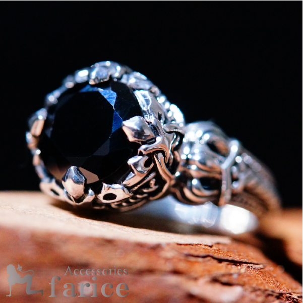 ★商品のサイズ★ 縦約16mm 横約25mm 高さ約30mm 重さ約8.4g ★素材★シルバー925 部分燻し仕上げ ブラックキュービックジルコニア ★商品のコメント★ 石が最も美しい輝きを見せるラウンド・ブリリアントカットで仕上げられたブラックキュービックジルコニアは、流麗なジェットブラックの光彩を存分に放ち出しメインに相応しい抜群の存在感を発揮しています。石のサイド周りには、4本の石留めの爪と縄目状のスパイラルデザインが装飾されていて、ややメカニカルなイメージのあるデザインですね。両アーム部分には左右対称にクラウンが装飾され、ハードながらも上品な印象も持たせています。アーム全体にスパイラル&シルバースタッドの模様が彫り込まれ、デザイン全体に統一感を持たせています。部分的に黒い燻し加工を施してあるため、繊細な彫り模様が綺麗に浮かび上がりよりハード感の漂うデザインの仕上がりとなっています。