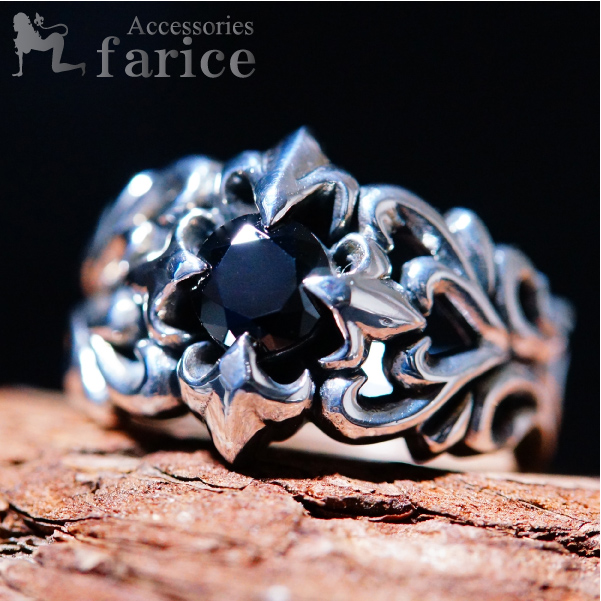 ★商品のサイズ★ 縦約18mm 横約25mm 高さ約26mm 重さ約11.9g ★素材★シルバー925 ブラックキュービックジルコニア ★商品のコメント★ デザインのメインとなるブラックキュービックジルコニアは、石が最も美しく輝くラウンド・ブリリアントカットで仕上げられ、ジェットブラックの艶やかな輝きを放っています。深い漆黒の輝きをよりハードに彩る装飾には、鋭い先端を持つ百合の花を模った銀の石留め装飾です。刺々しい百合の花は石の四方向に飾り付けられ、独特のフォルムからくり出すハードデザインは存在感抜群です。さらにアラベスクの紋様がサイドからアーム後方にかけて装飾され、迫力のある曲線模様は透かし彫りされることによってさらに拍車が掛かり、デザインにエネルギッシュなイメージを与えています。