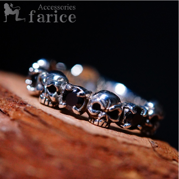 ★商品のサイズ★ 縦約6mm 横約25mm 高さ約23mm 重さ約4.8g ★素材★ シルバー925 燻し仕上げ ブラックキュービックジルコニア ★商品のコメント★ ミニスカル&ブラックキュービックジルコニアを交互に飾った細身タイプのハード系デザインスカルリングです。シンプルなデザインながらもブラックキュービックジルコニアを使うことでハード感が増しスカルリングらしい存在感を持たせています。4ポイントで飾り付けられたブラックキュービックジルコニアの艶やかな黒い輝きが、シンプルなデザインに高級感のあるイメージを持たせています。スカル&ブラックキュービックジルコニアをシンプルに纏めたデザインは、サラッと着けるだけでも十分な存在感を発揮し指元にハードな彩りを与えてくれます。