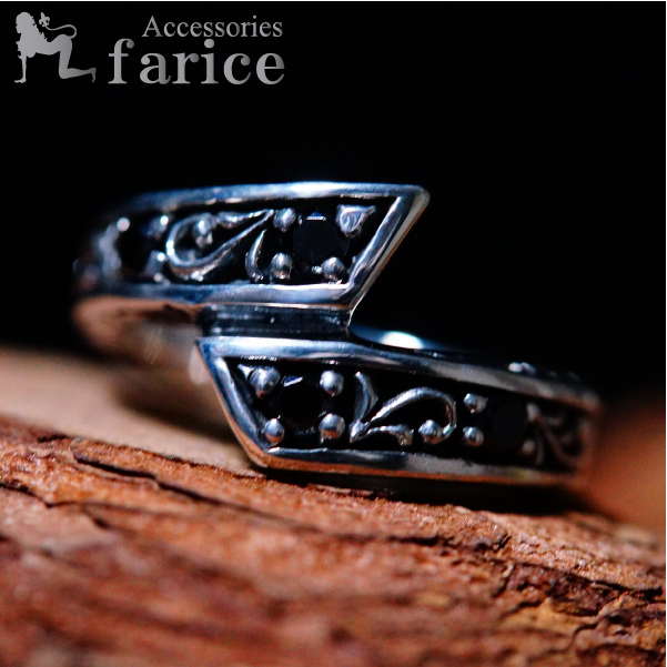 ★商品のサイズ★ 縦約14mm 横約25mm 高さ約25mm 重さ約10.5g ★素材★シルバー925 部分燻し仕上げ ブラックキュービックジルコニア ★商品のコメント★ 上下にずらしたリングのフォルムデザインがとても華やかですね。彫り込んだ内部には、ブラックキュービックジルコニアとアラベスクの紋様が交互に配置され、より華やかでハード感のある装飾がなされています。ベースの土台部分に施された燻しの黒い配色が、落ち着いた雰囲気でクールな存在感が十分に発揮されています。画像では見えづらいのですが、リングの上下や先端部分にもトライバル風のアラベスク模様が彫られていて、細かなところまでとても手の込んだデザインとなっています。