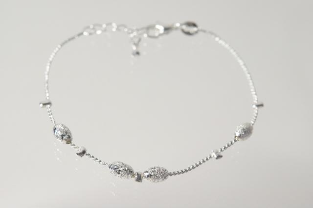 ★商品のサイズ★ 長さ(アジャスター調節)約165〜195mm チェーン幅約1mm 装飾:オーバルボール幅約3.5mm 重さ約2.2g ★素材★ シルバー925+ホワイトロジウムコーティング ★商品のコメント★ ホワイトロジウムコーティングをまとい数百もの打ち出しを行うことで、想像以上の輝きを放つキラキラのボールチャームは、それぞれのストッパー間を滑るように可動します。編みこんだチェーン部分がシンプルなだけにとても映えます。キャッチ部分はカニカンタイプになっており外れにくくアジャスターがついておりますので、どなたでもお楽しみ頂けます。