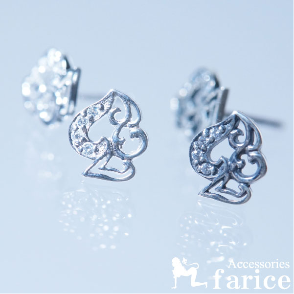 アラベスク透かし彫りホワイト or ブラックスペード ホワイトキュービックジルコニア シルバージュエリースタッドピアス